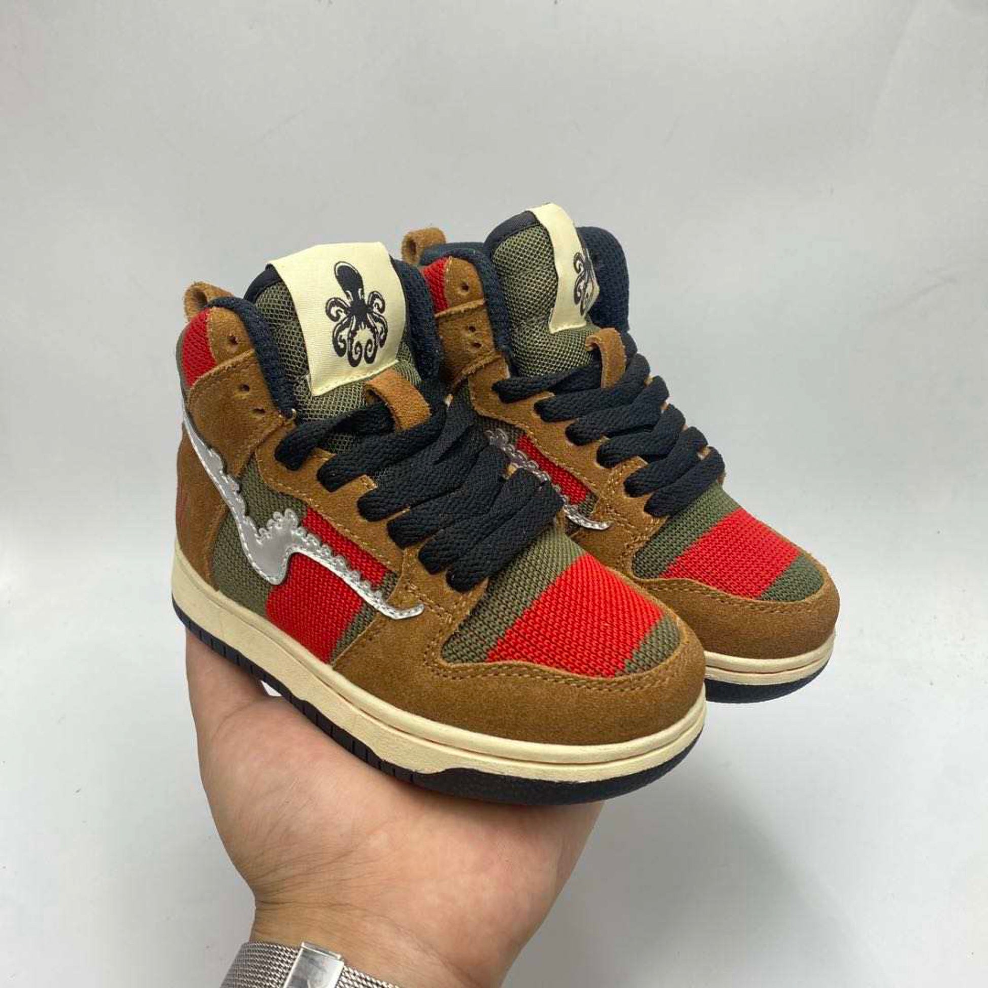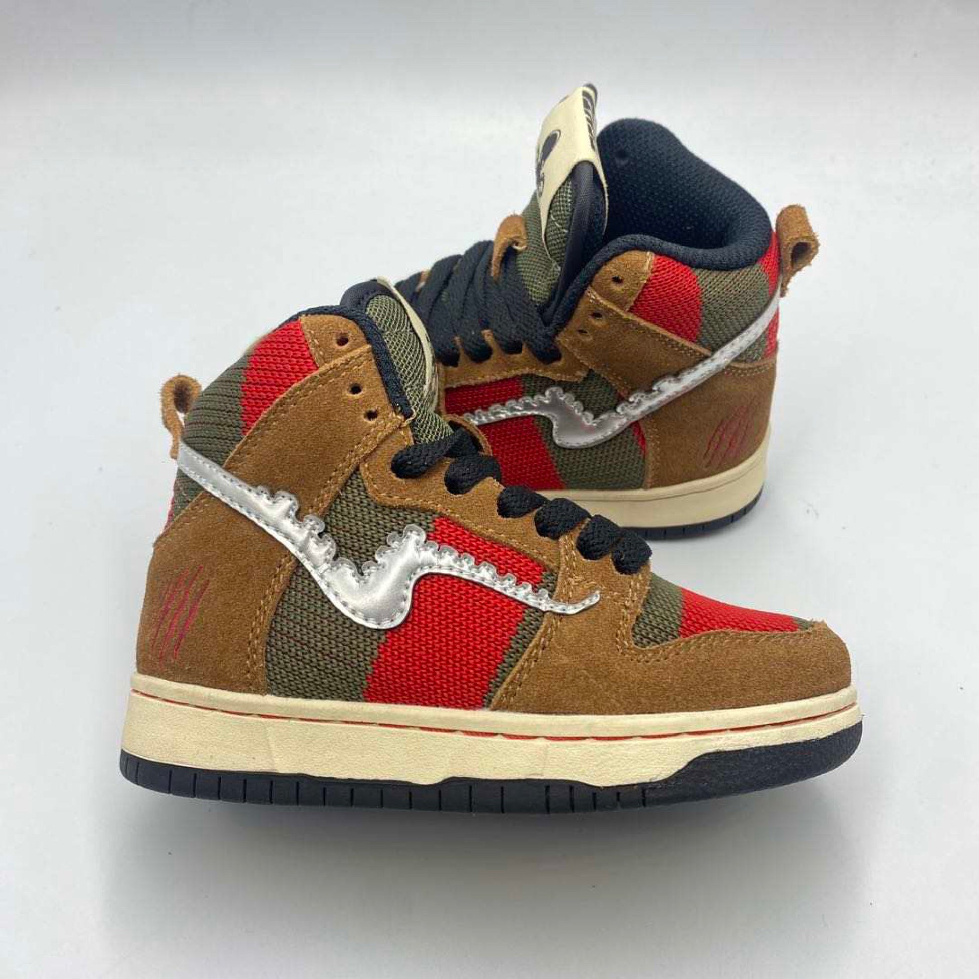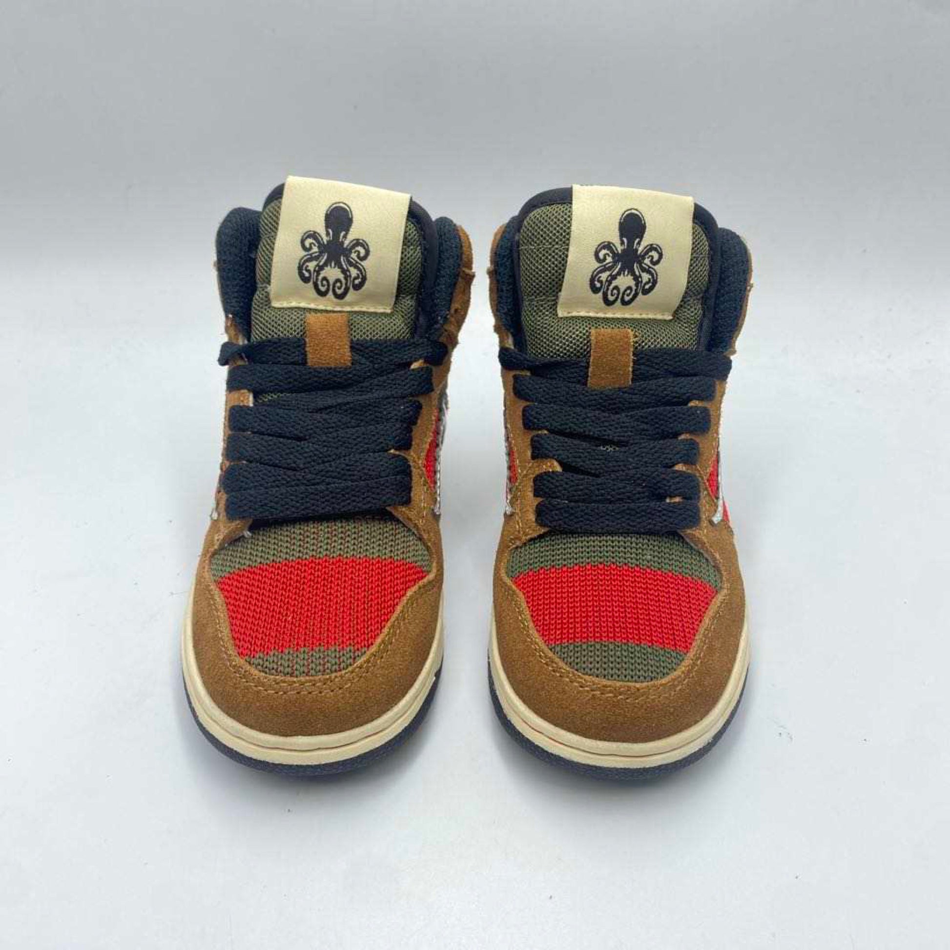 The TENTA “Wanna Get High…tops?” CHILDRENS SIZES come to you this Halloween Season with some very high quality materials, comfy fit and unique details. The perfect tribute to the man himself incudes the signature red and green striped sweater material over the heel, the side panels and toebox, a beautiful tan suede to indicate the glove and shiny chrome TENTA tentacle logo representing the blades!! They come laced with black shoelaces and also come with spare cream color laces that match the T-shirt!